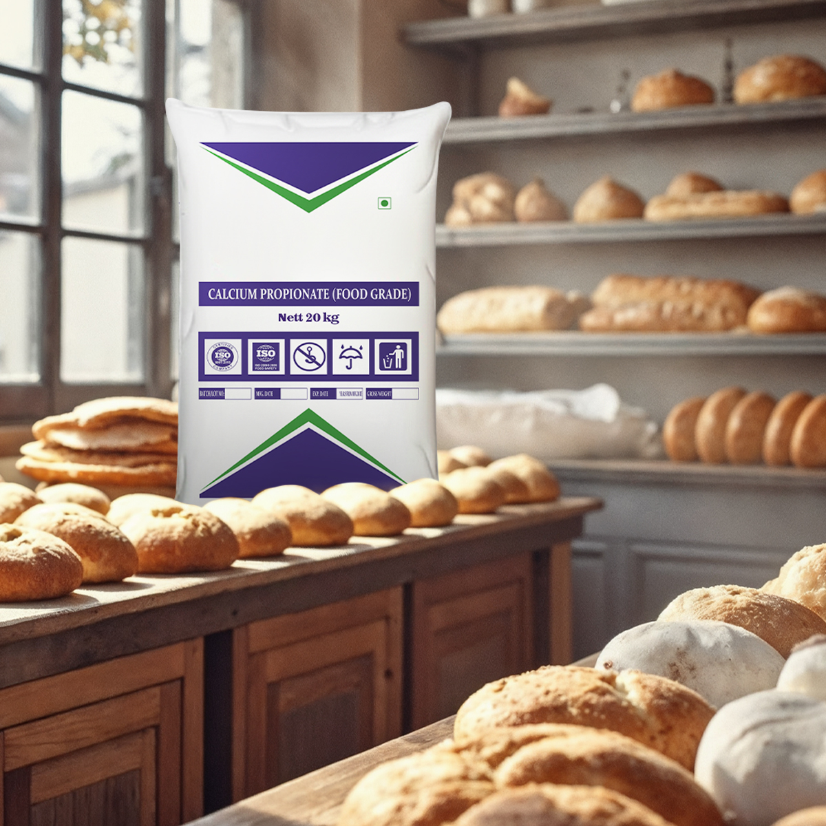 Calcium propionate extends the shelf life of various goods by interfering with the growth and reproduction of molds and other microorganisms